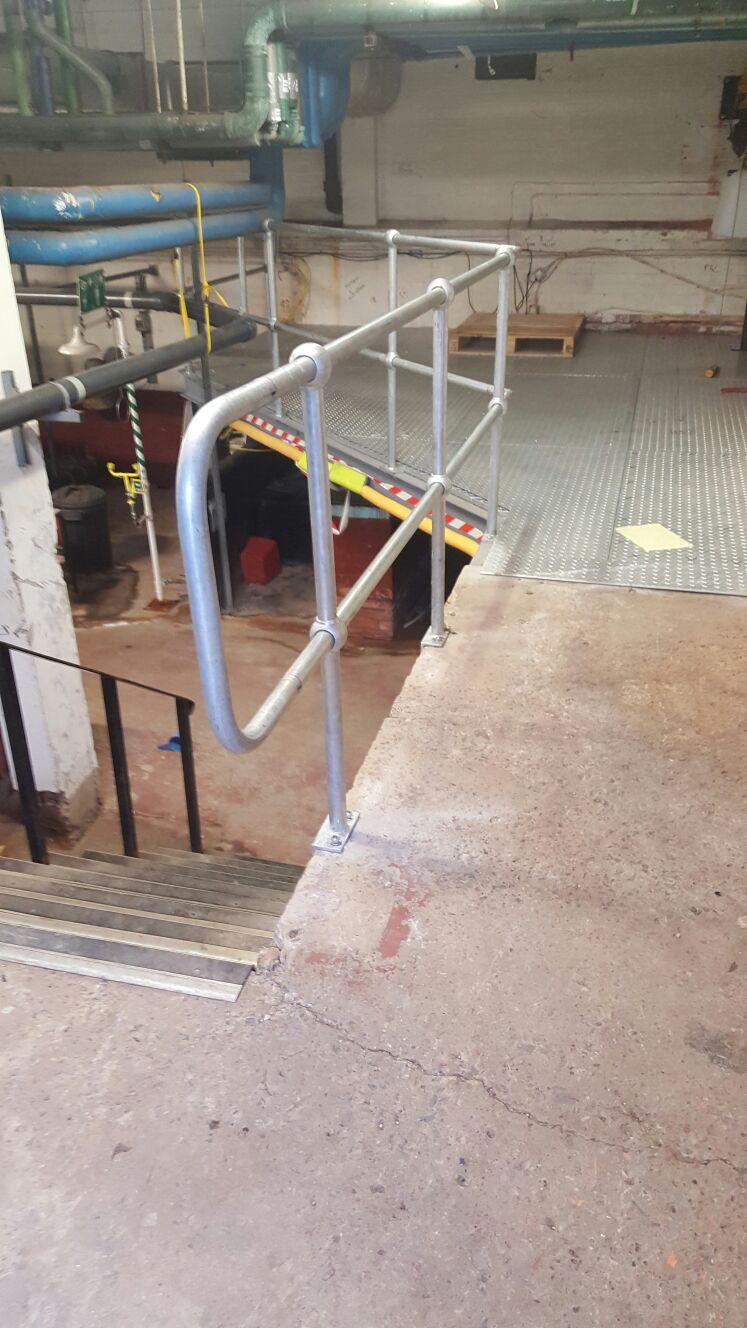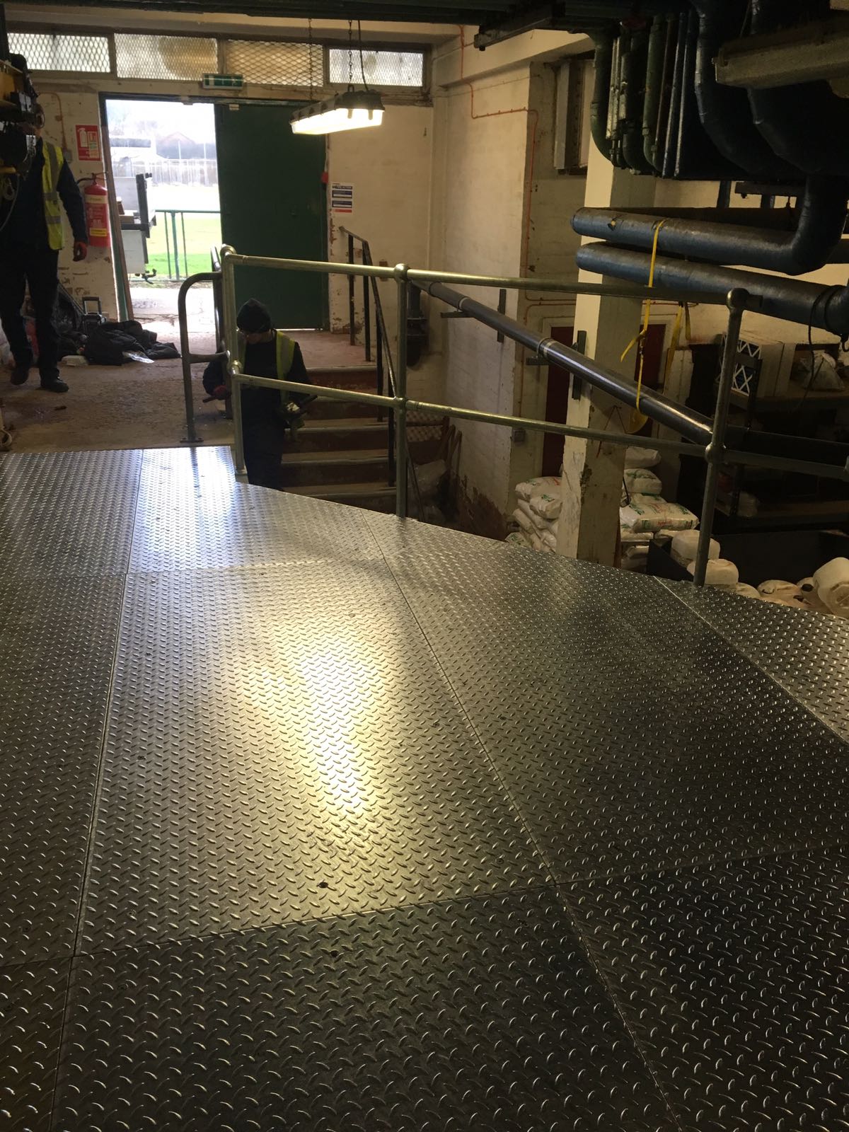 A steel mezzanine platform designed to fit with the clients current layout, fabricated and installed. Wirral Borough Council contacted us to provide a solution for Woodchurch Swimming Baths as staff were having to carry dangerous chemicals down a flight of stairs upon delivery. We installed a platform to integrate with their existing set up so the chemicals could be wheeled safely into the chemical dosing room and then gravity fed to their required destination.